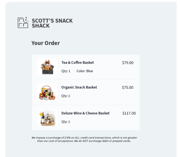 - Checkout notice: Clearly disclose the surcharge before the transaction is completed.
